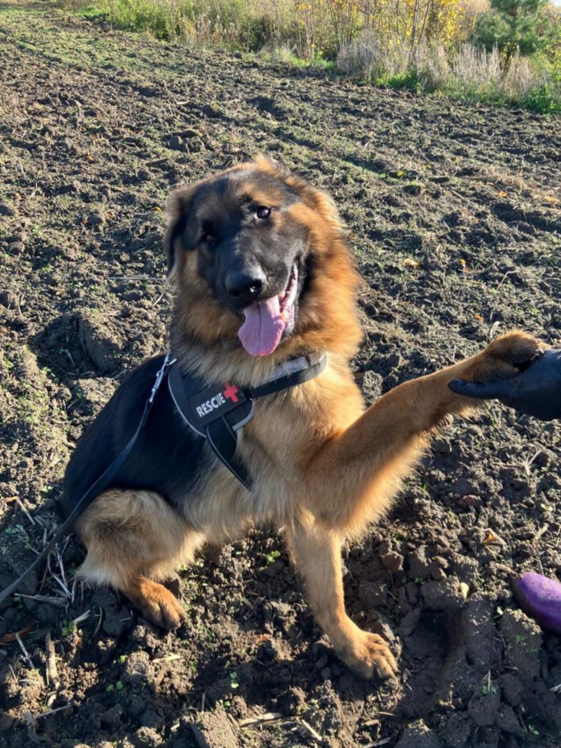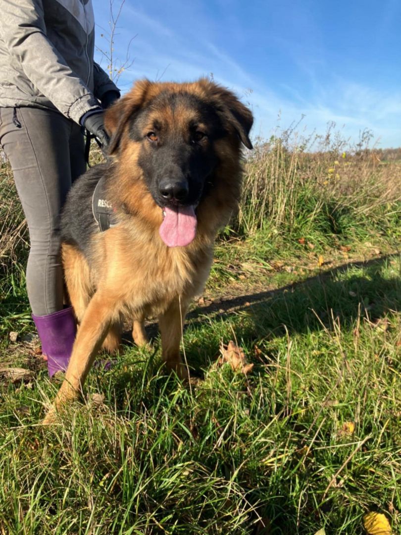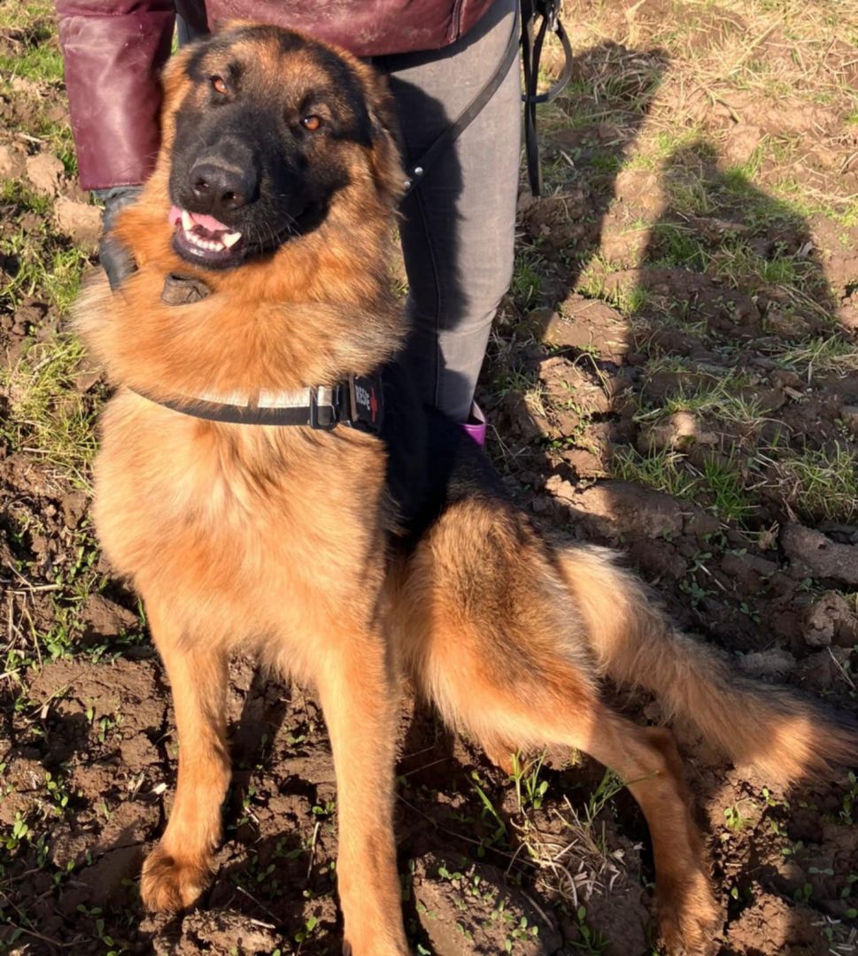 To młody chłopak w typie owczarka niemieckiego. Ma w sobie cały ich urok: mądrość w oczach, ogromne serce i chęć bycia blisko człowieka.