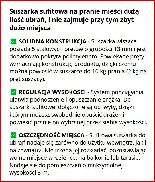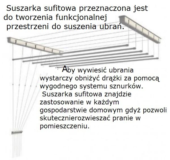 Witam serdecznie,od 20 lat zajmuję się montażem suszarek sufitowych przeznaczonych do suszenia prania.Suszarka sufitowa dzięki uniwersalnej konstrukcji i wielu dostępnym rozmiarom zmieści się w każdym pomieszczeniu od małej łazienki po wielki taras.Dzięki opuszczanym prętom,których opuszczanie nie wymaga wysiłku masz łatwy i szybki dostęp do powieszenia swojego prania.