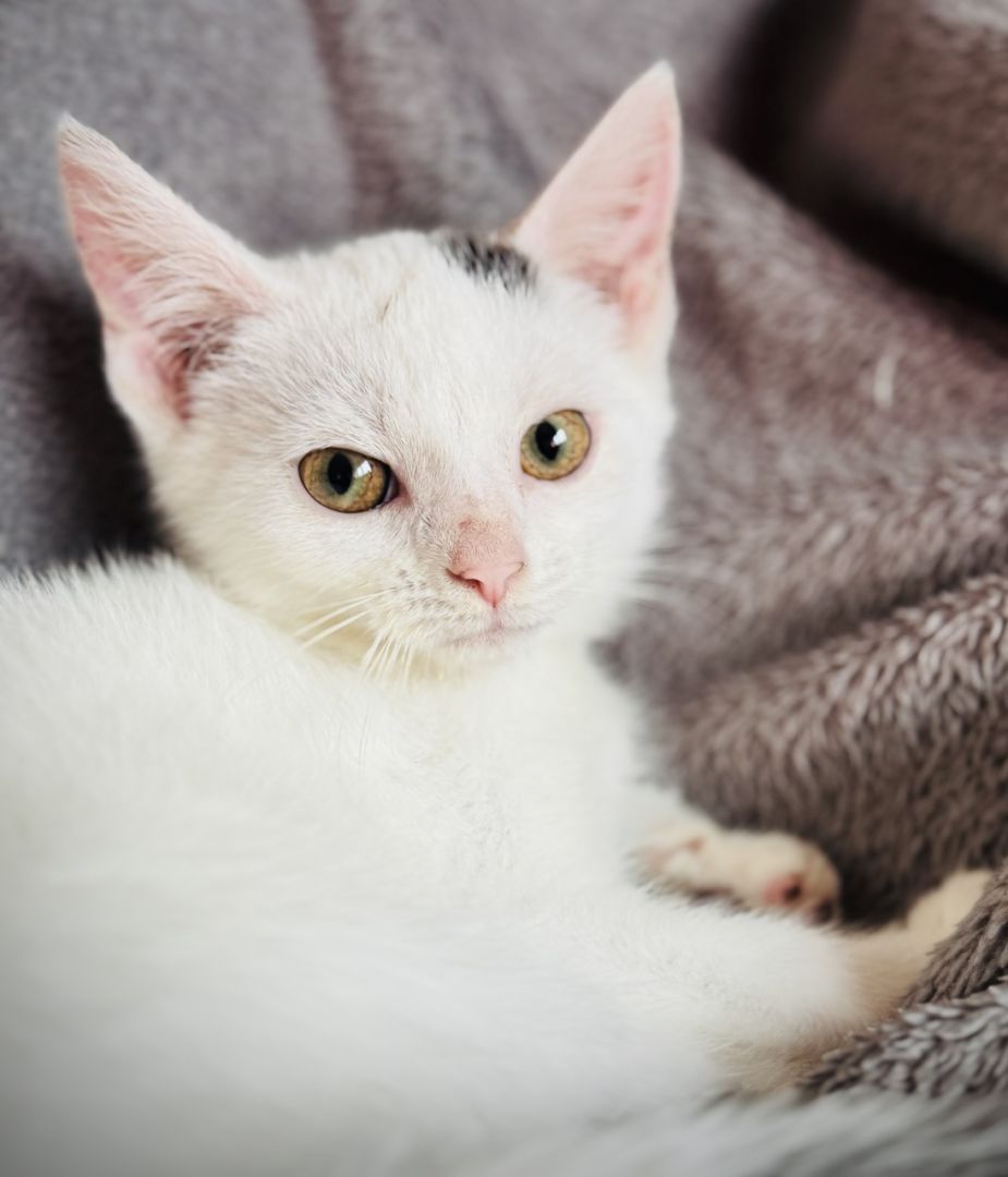 Lotka – subtelna koteczka z jedną czarną plamką na głowie. Delikatna, przytulaśna i bardzo ciekawska.